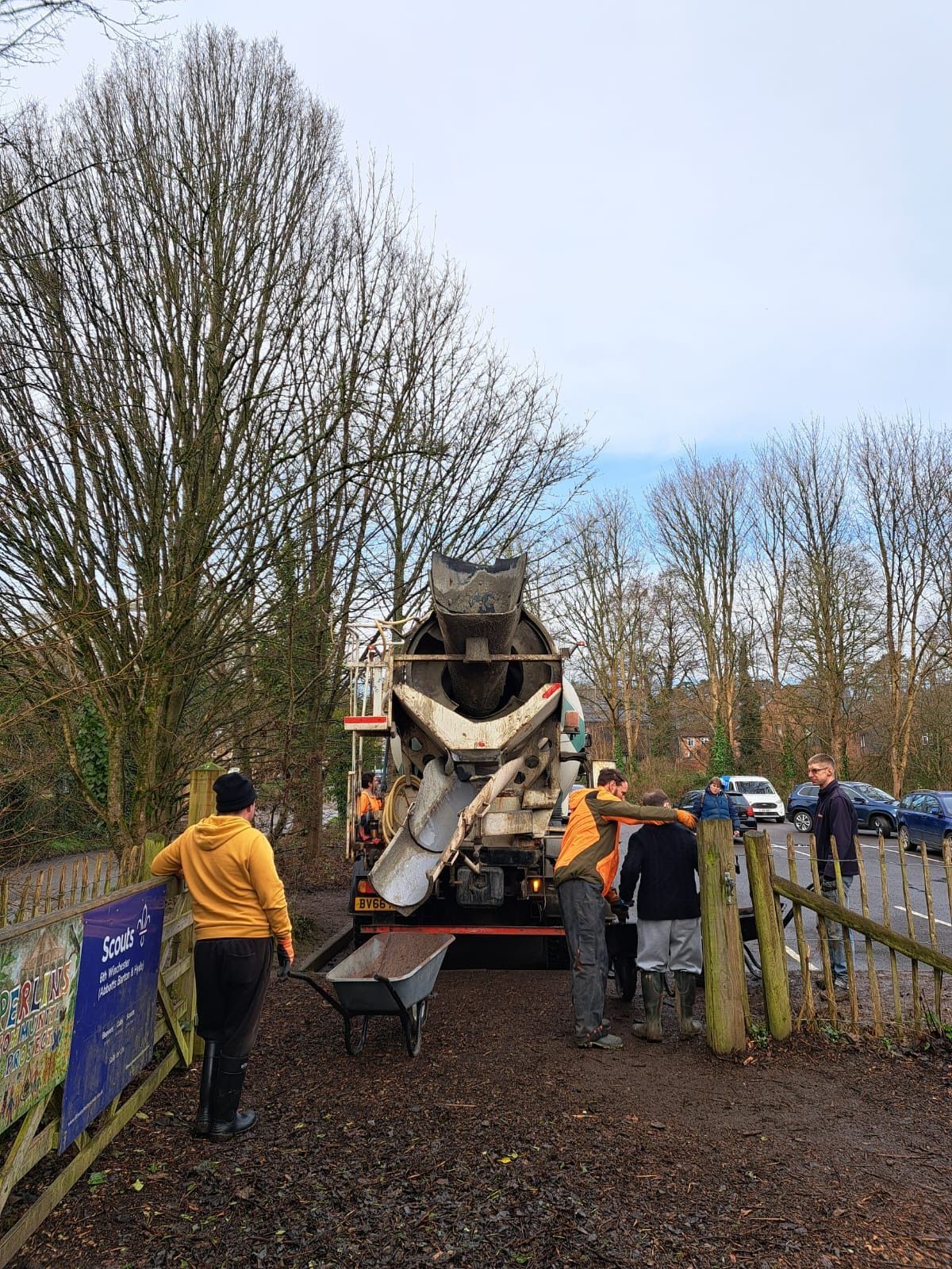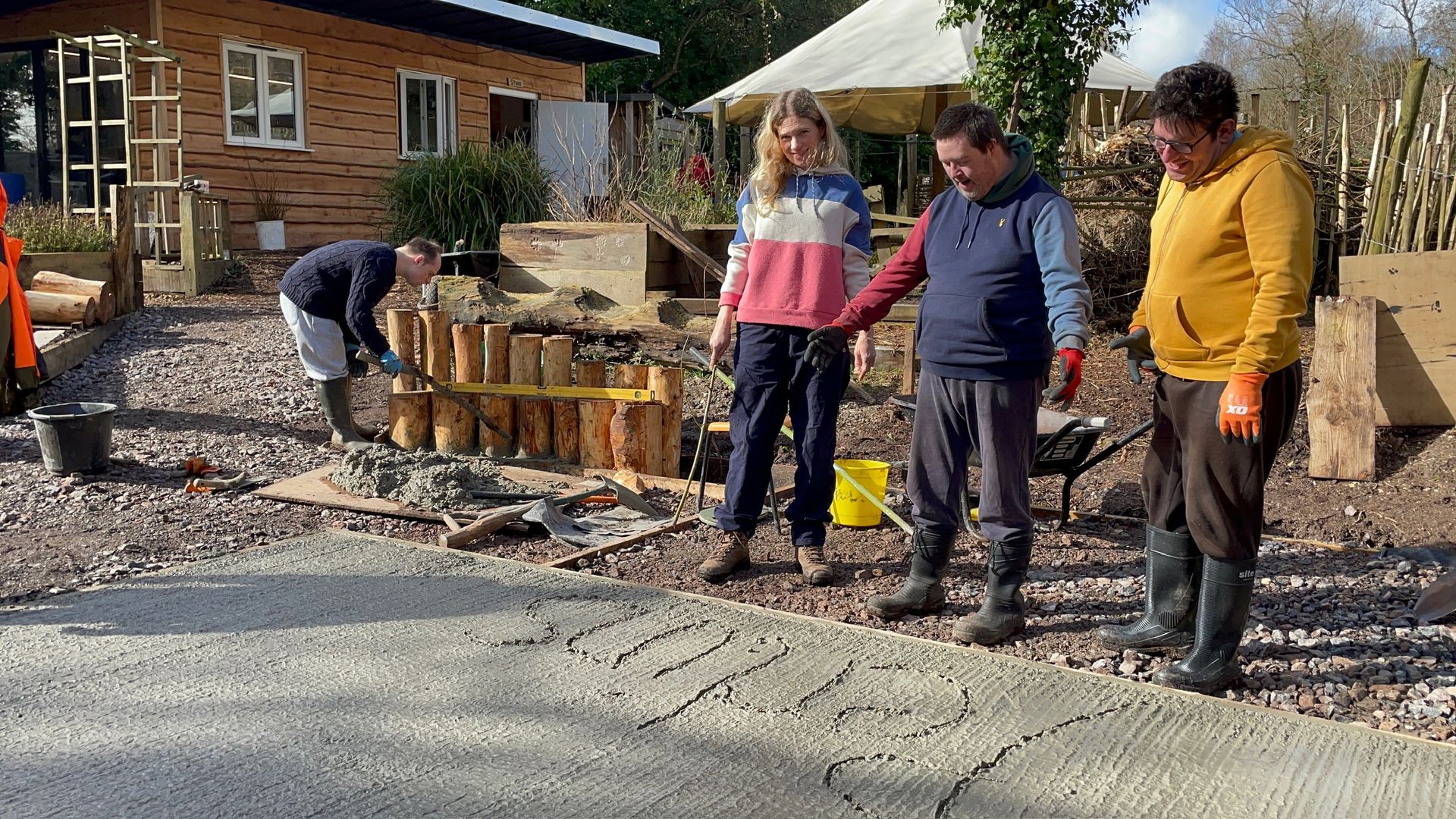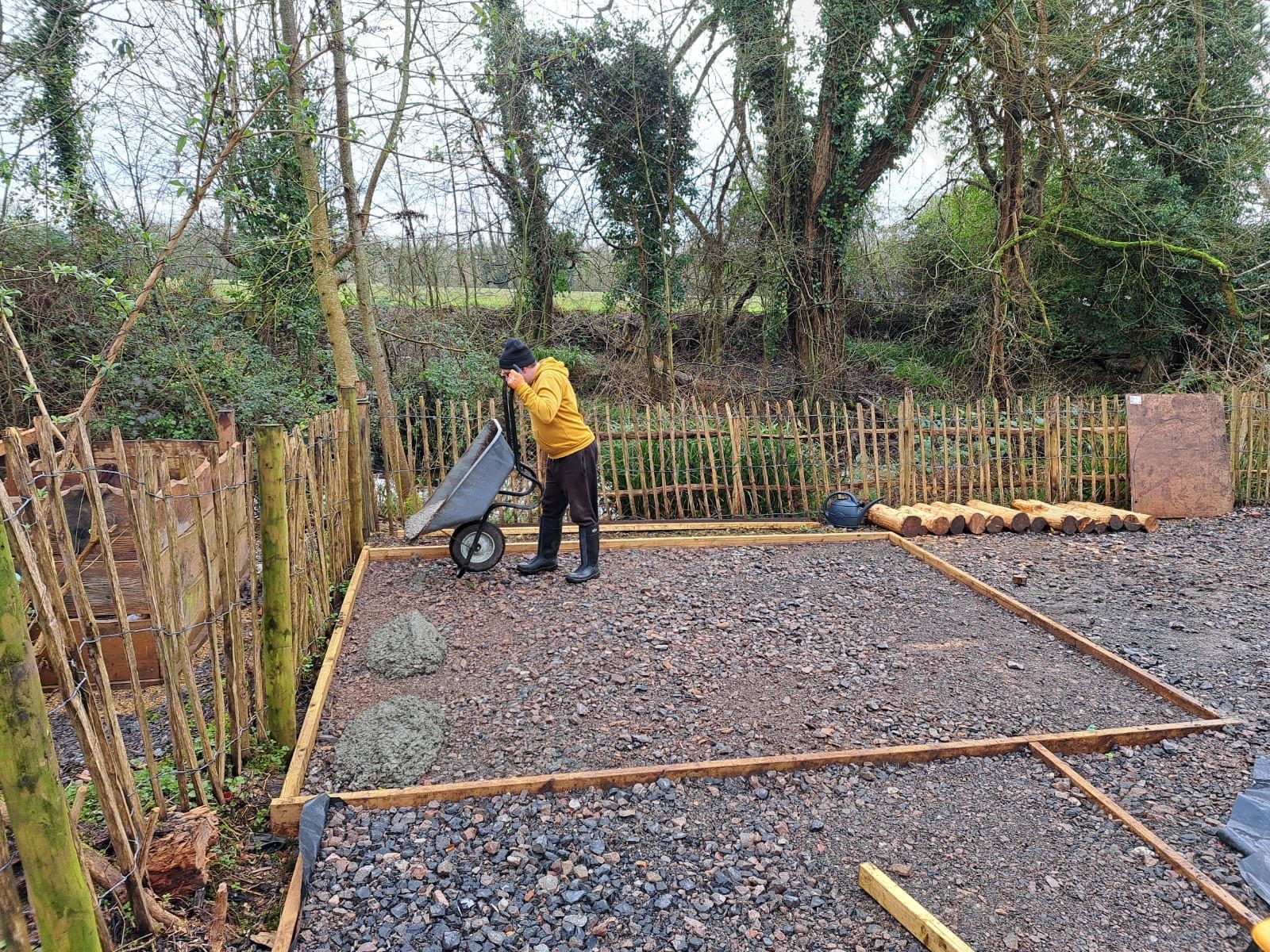 Building a concrete base using a wheelbarrow. Lots of project members helped