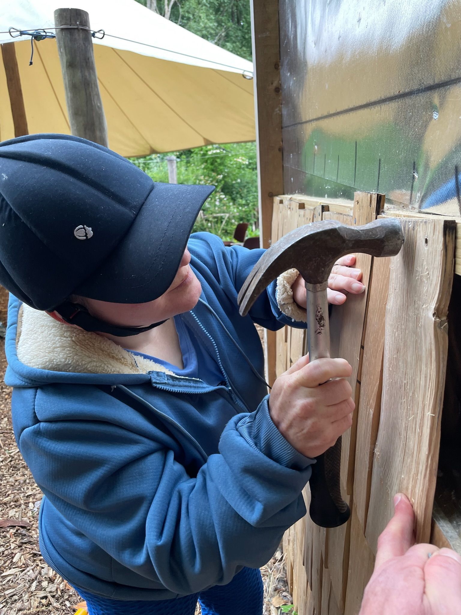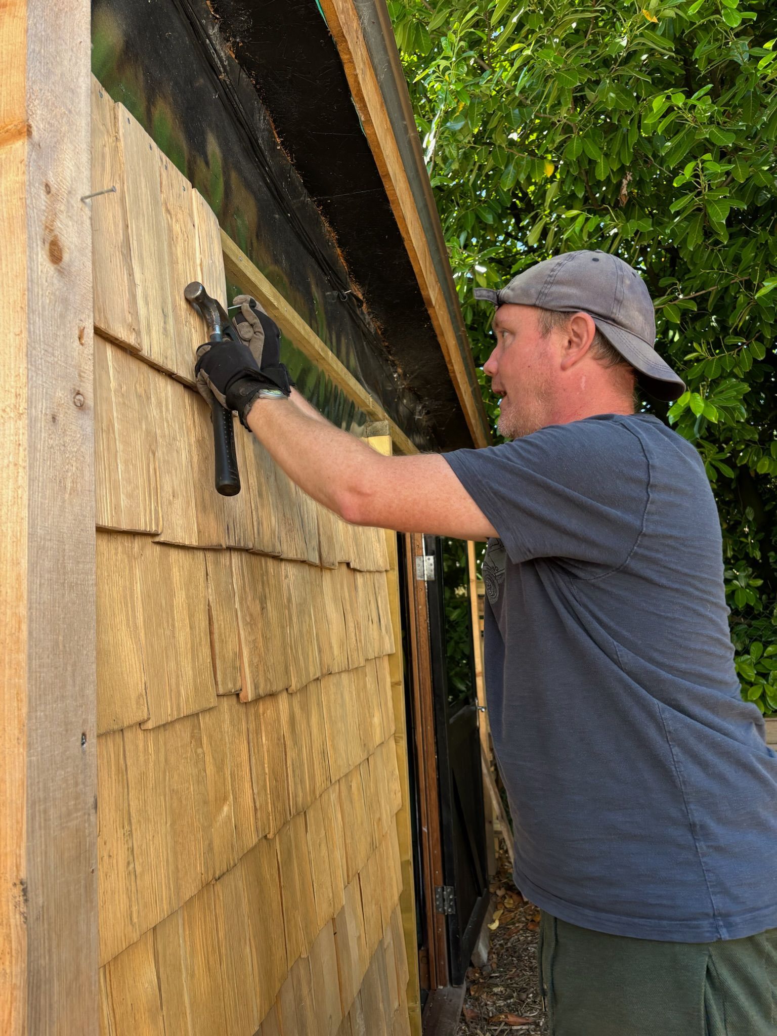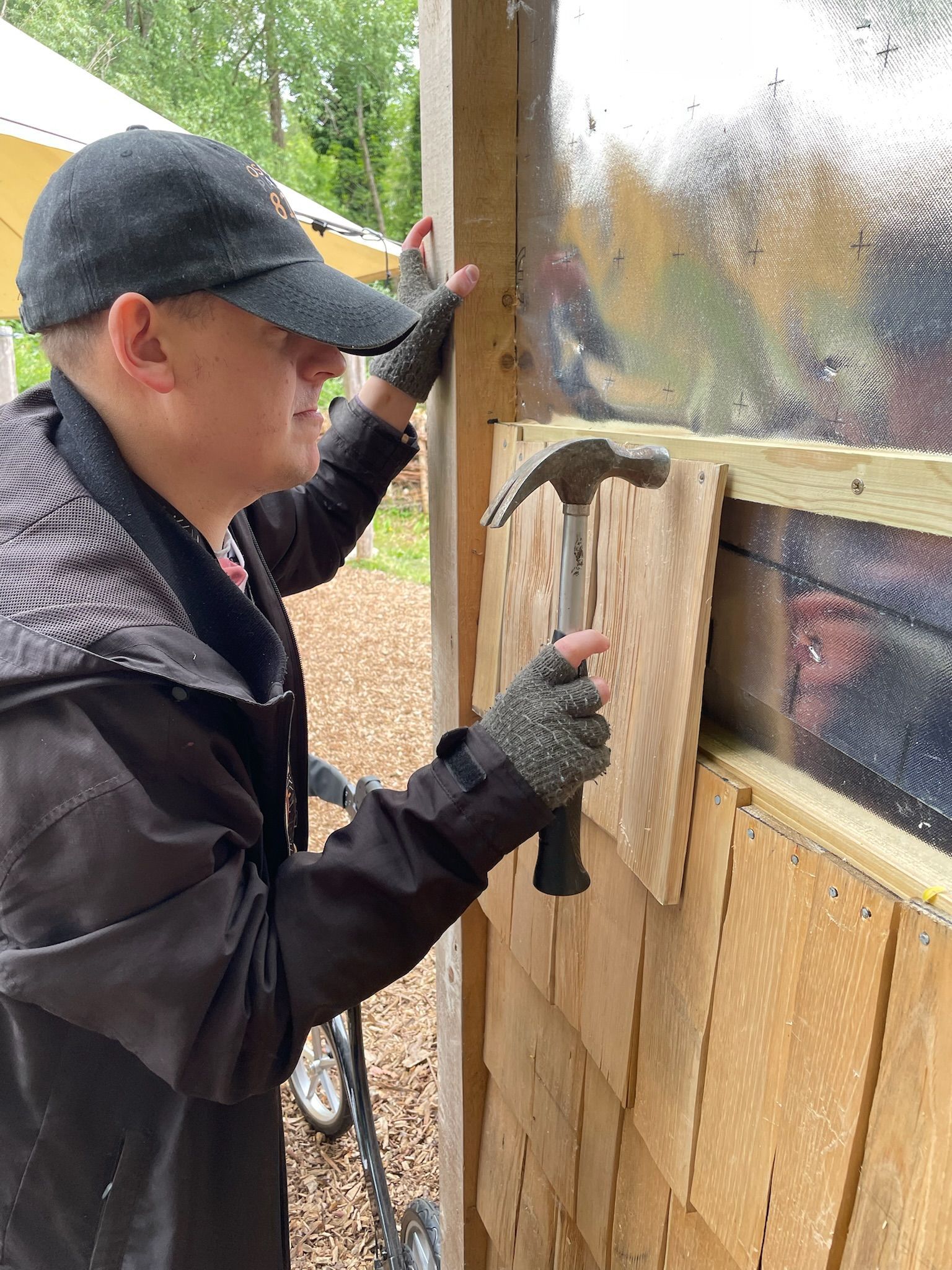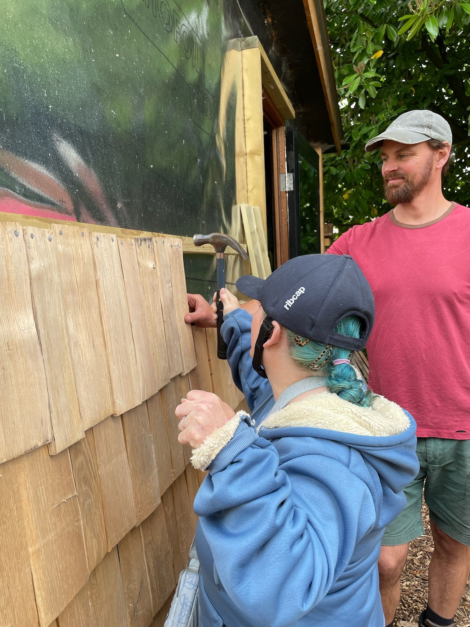 We focused on the outside, cladding the studio with beautiful Douglas and fir and larch waney edge cladding. People really enjoyed nailing up these boards.