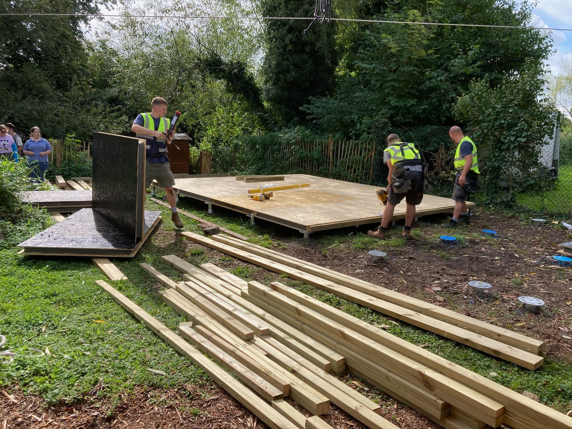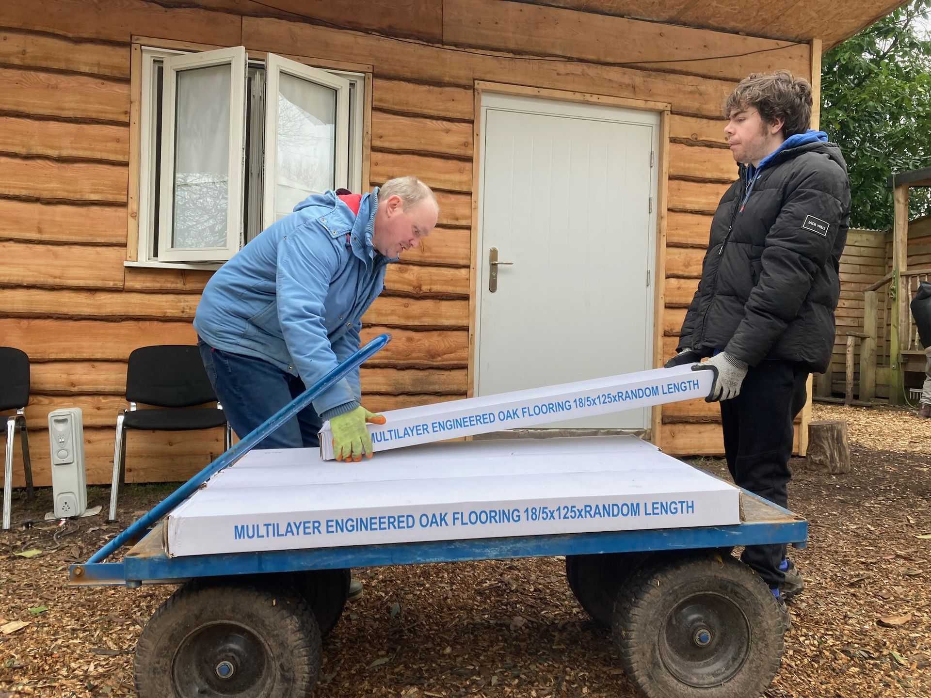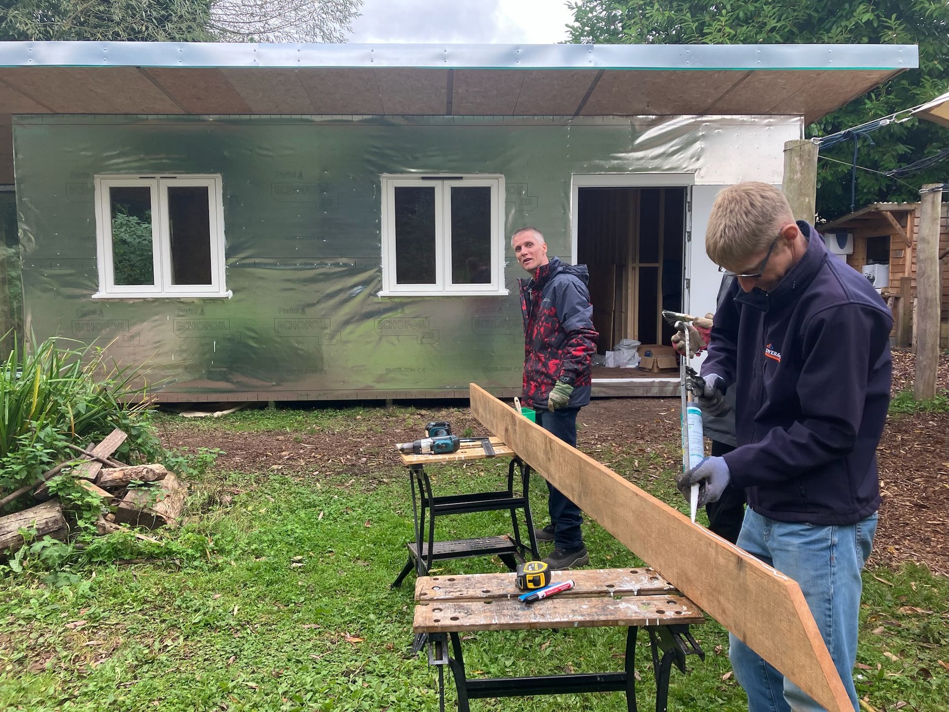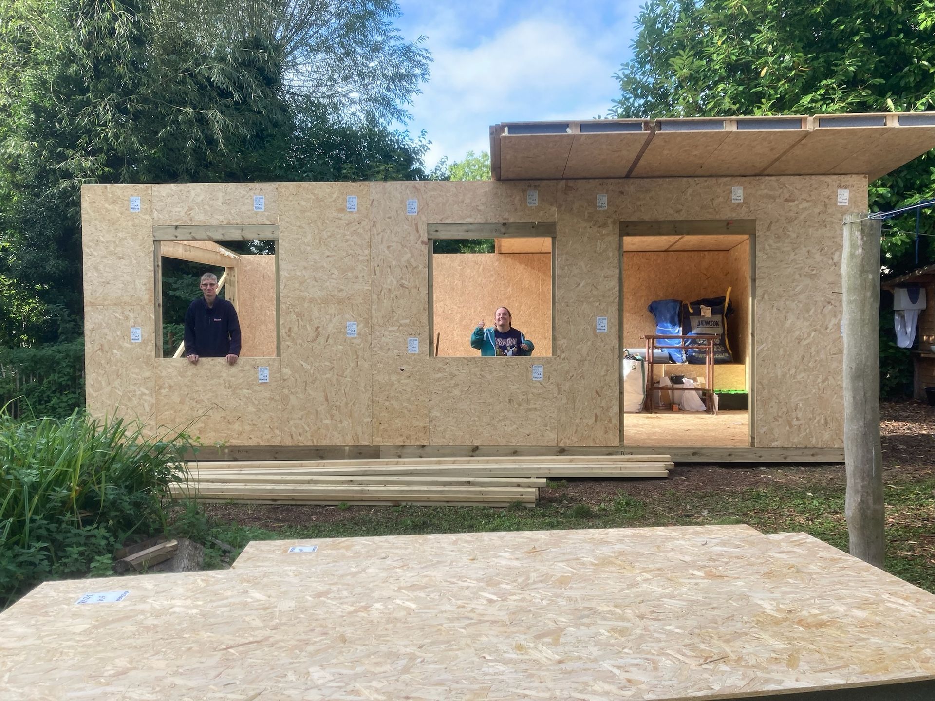 It is a special type of wooden building made of highly insulated panels. These were delivered on a flat bed truck and we helped to carry and move them from the car park. The panels formed a basic shell of the building with no windows and doors.