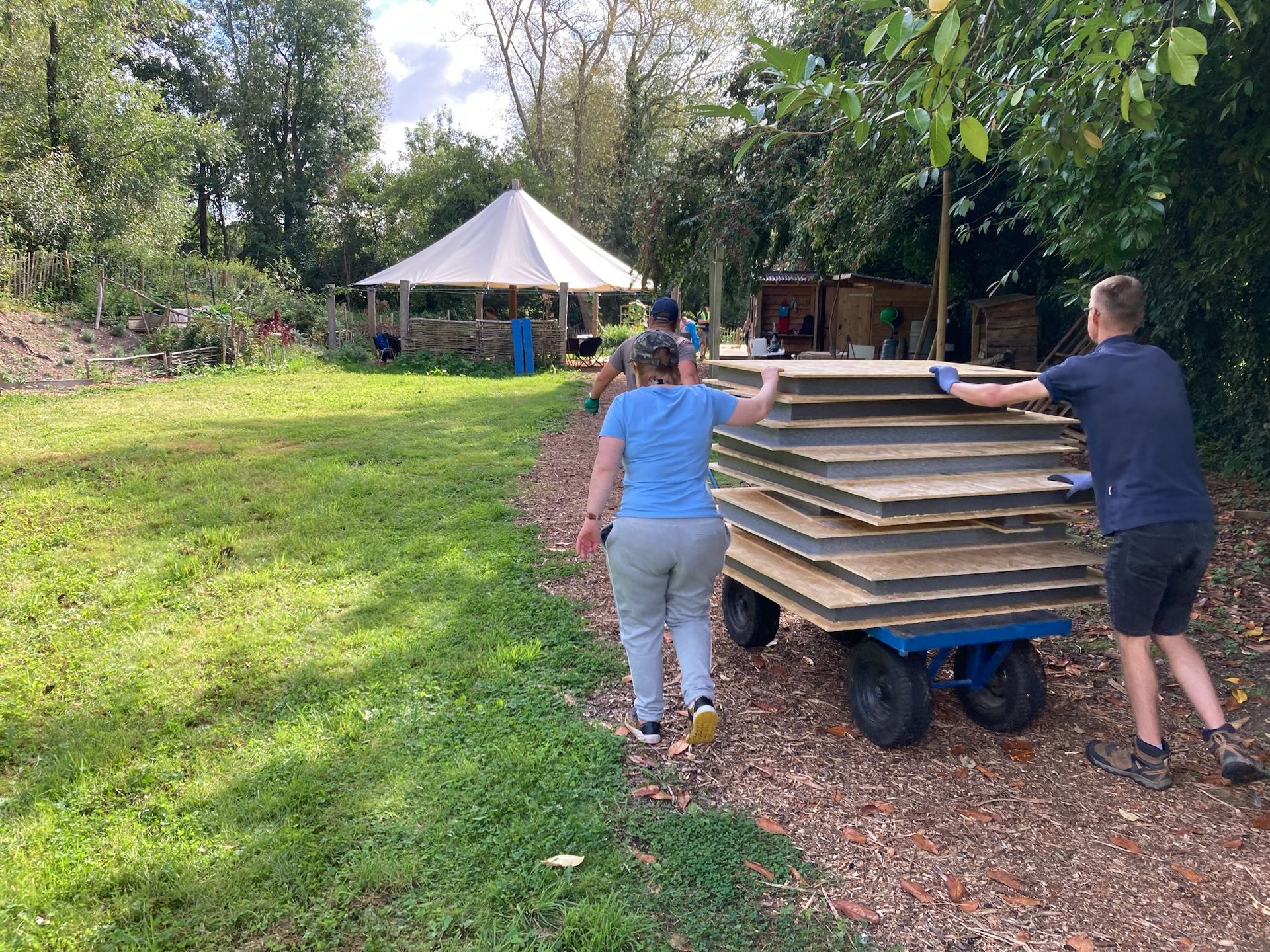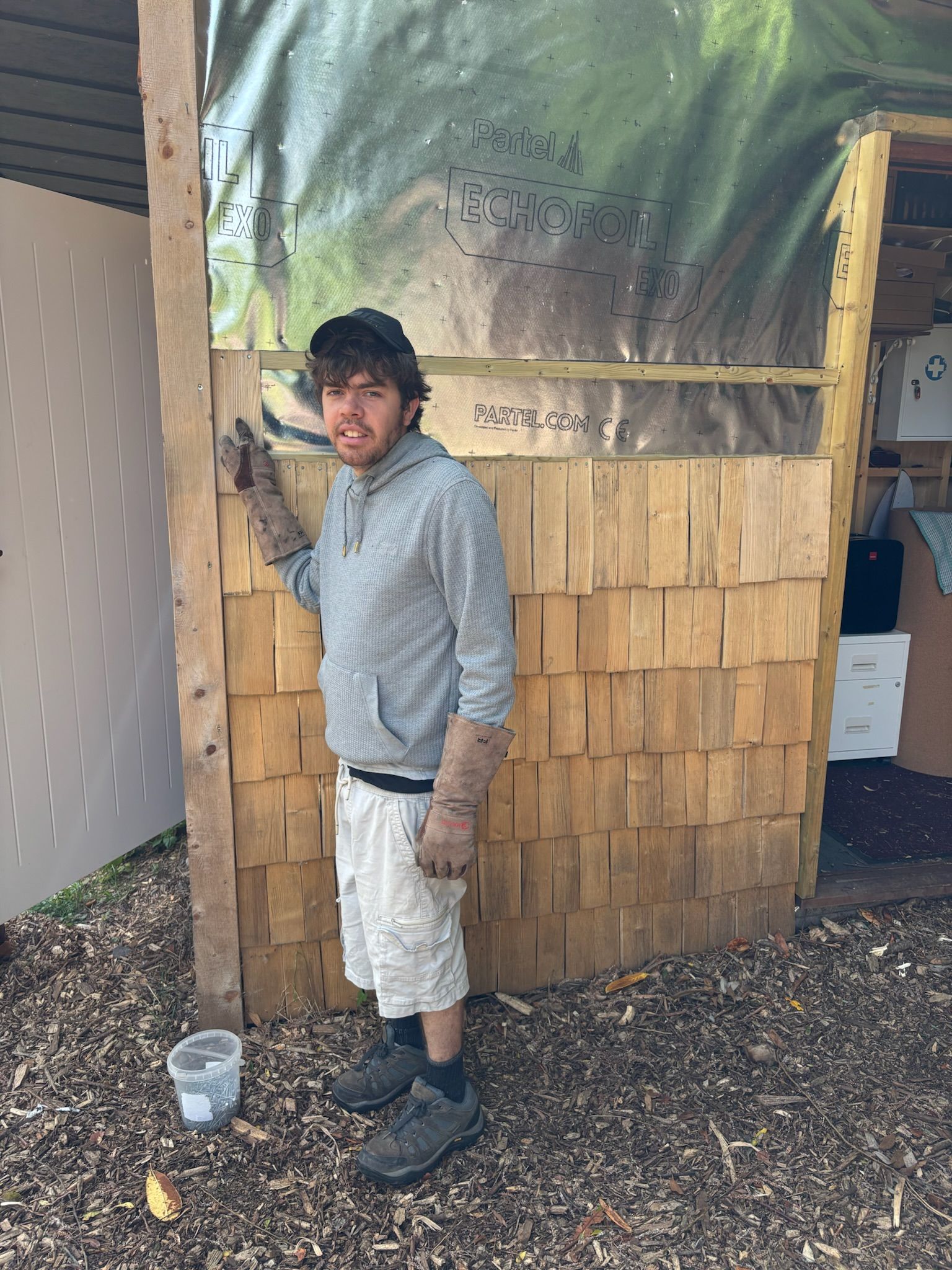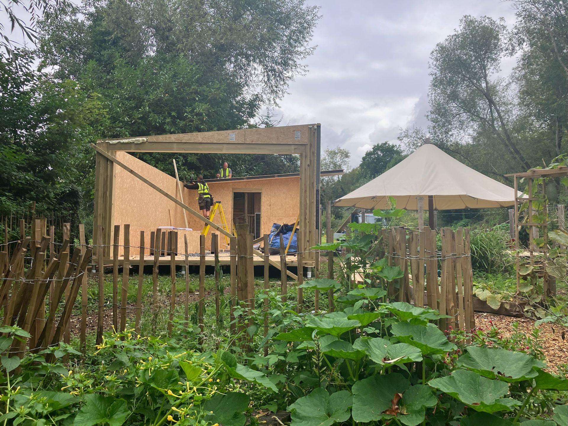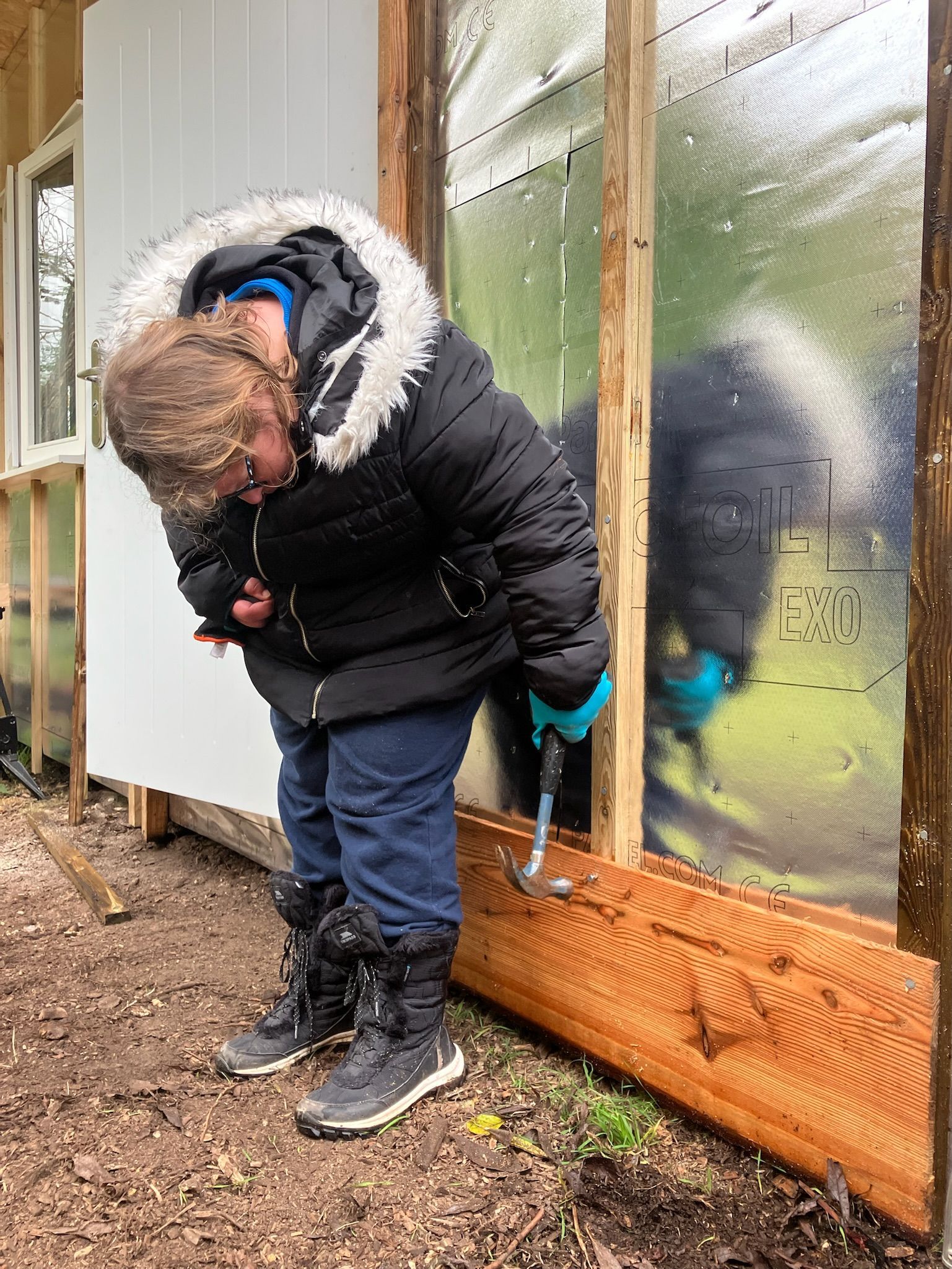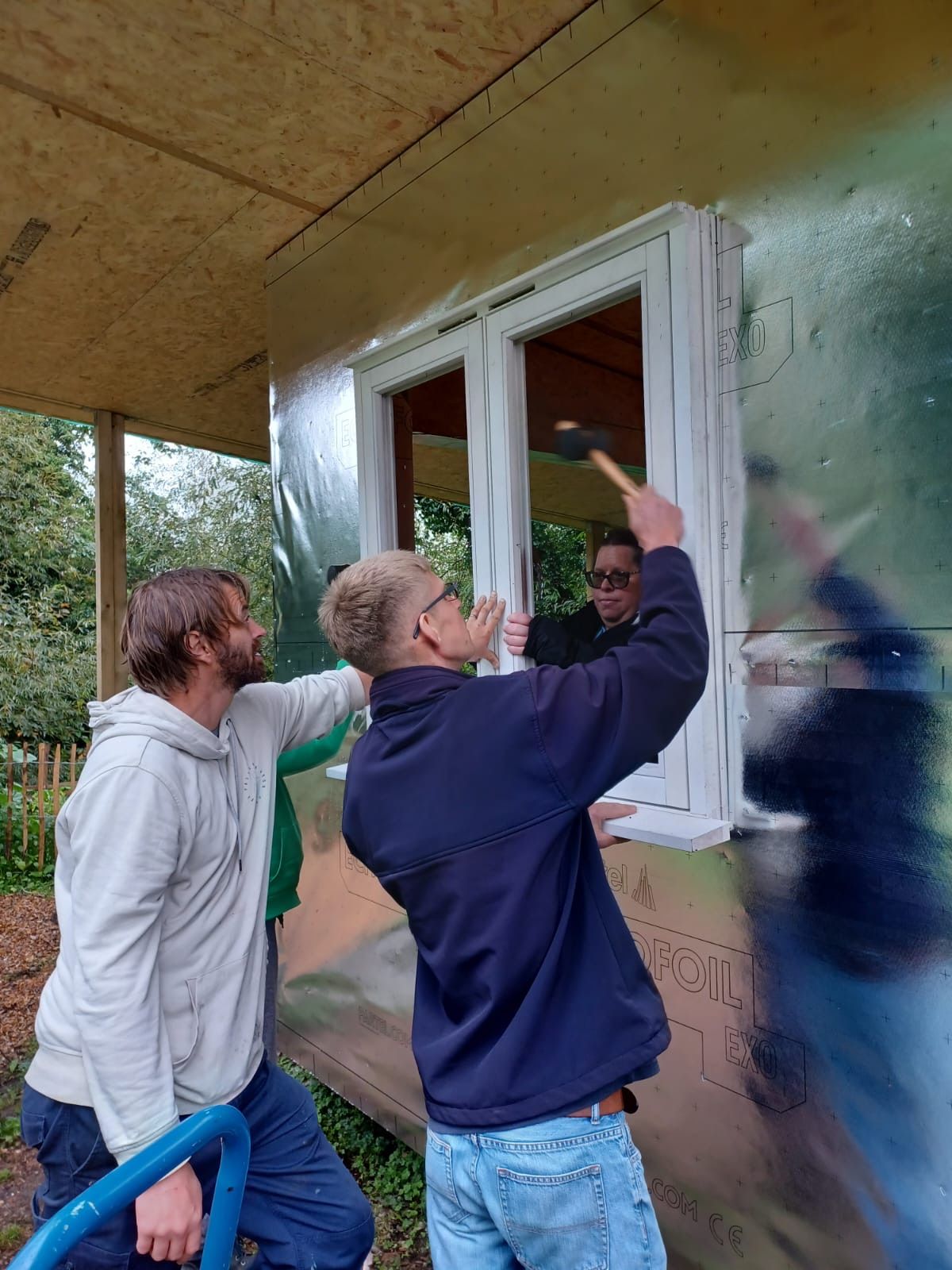 It is a special type of wooden building made of highly insulated panels. These were delivered on a flat bed truck and we helped to carry and move them from the car park. The panels formed a basic shell of the building with no windows and doors.